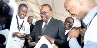 President Uhuru Kenyatta tries a locally assembled phone at the Pre-Global Entrepreneurship Summit at KICC on Wednesday. PHOTO | FILE