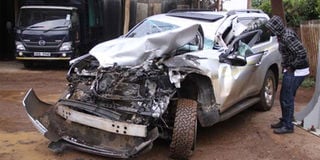 The wreckage of Julius Yego’s Toyota Prado at Eldoret Police Station. PHOTO | JARED NYATAYA