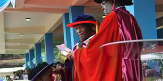 A graduand is being conferred with PhD by former University of Nairobi Vice Chancellor George Magoha (right), now Education Cabinet Secretary. FILE PHOTO | NMG