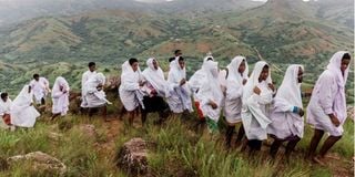 Followers of the Baptist Church from the Ekuphakameni group, also known as the Shembe Church, dressed in traditional attire, climb the Nhlangakazi Holy Mountain in Ndwedwe 85 kilometres north of Durban. The devotees climb the mountain as part of their annual pilgrimage. FILE PHOTO | AFP