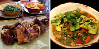 Grilled rabbit, sukuma wiki and fried plaintains (left) and Char-grilled githeri with avocado and kachumbari by Nyama Mama executive chef Lesiamon Sempele. PHOTOS | DIANA NGILA | NMG