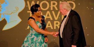 Founder of WTA, Graham Cooke congratulates Kenyatta International Convention Centre CEO Nana Gecaga during the World Travel Awards held in Nairobi on October 15, 2022. PHOTO | POOL