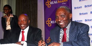 Britam group MD Benson Wairegi (left) and Real Insurance chairman Sam Kamau when they signed an acquisition deal. Photo/FILE
