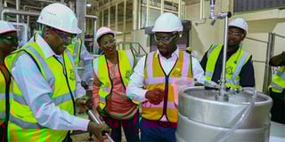EABL Group chairman Charles Muchene (left) pumps Senator Keg from a barrel as divisional sales manager Lake Region Kiragu Ngugi (second right) and others look on during an inspection tour of the Kisumu Brewery plant ahead of launch. FILE PHOTO | NMG