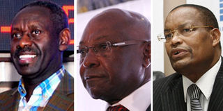 From left, Faida Investments transaction advisor Bob Karina, Dyer & Blair chairman Jimnah Mbaru and Standard Investment Bank chairman James Wangunyu. PHOTOS | FILE