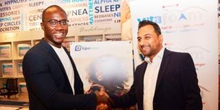 Eric Muli (left), chief executive officer of LipaLater and Sharad Barot, chief operations officer of Vitafoam Products Limited during the launch a past partnership. FILE PHOTO | NMG