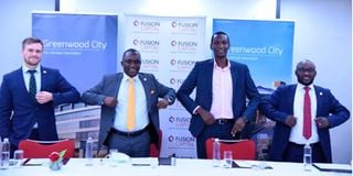 From left: Fusion Capital's director, real estate James MacLean, Group CEO Daniel Kamau, Meru County CEC Trade, Investment, Industrialisation, Tourism and Cooperatives Maingi Mugambi, Fusion Investment Management director Michael Kimondo, during the announcement by the company on the Sh800 million raised for the completion of Greenwood City Mall in Meru County on June 22, 2021. PHOTO | DIANA NGILA | NMG