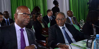 Safaricom CEO Bob Collymore (left) and chairman Nicholas Ng’ang’a during the telco’s annual general meeting at the Bomas of Kenya in Nairobi on Friday. PHOTO | FILE