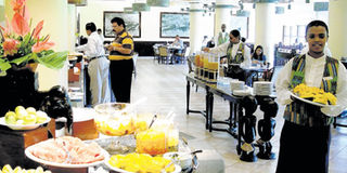 Guests are treated to a buffet at Movenpick Hotel . TPS East Africa recently acquired a 20 per cent stake in Royal Palm Hotel from Movenpick Hotels and Resorts of Tanzania. File