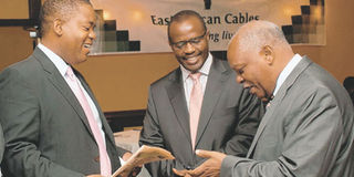 From left: TransCentury CEO Gachao Kiuna, banker Peter Munyiri and the chairman of East African Cables, Mr Zephania Mbugua, during a past EA Cables function. TransCentury has been valued at Sh12.5 billion. file