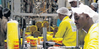 Workers package edible oil at the Bidco plant in Thika. The company controls over 60 per cent of the cooking fat market in Kenya. Photo/FILE