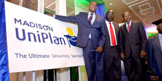 From left: Madison Insurance CEO Joshua Njiru, his Commission for University Education counterpart Prof David Some and Madison chairman Samuel Ngaruiya during the launch of UniPlan. PHOTO | SALATON NJAU