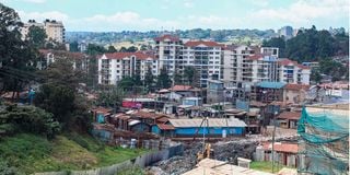 An aerial view of Kawangwae, Nairobi showing informal housing in the foreground contrasted with emerging high-rise residential and commercial buildings in the background, highlighting rapid urban development in the area on January 19, 2026. Lucy Wanjiru | Nation