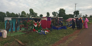 Traders who set up mobile studios along Ng'iya-Ndori road, K'ogelo in a bid to cash in on Obama's visit. PHOTO | Justus Ochieng' | NMG
