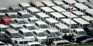 Newly imported second-hand cars lie at a yard in Mombasa as shortage of number plates continues to bite importers.