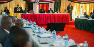 President Uhuru Kenyatta with Deputy President Dr. William Ruto and Vice Chair Council of Governors Mwangi Wa Iria arrive during the 7th National and County Governments Summit at Sagana State Lodge, Nyeri County. PHOTO | PSCU