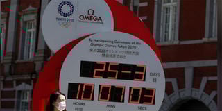 A woman wearing a protective face mask due to the outbreak of coronavirus disease (Covid-19) walks next to Omega clock in Tokyo, Japan on March 25, 2020. It was being used as a countdown clock for the Tokyo 2020 Olympics Game, which have been postponed to 2021. PHOTO | REUTERS