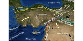 This area of Turkey is prone to earthquakes as it lies at the intersection of three of the tectonic plates that make up the Earth’s crust: the Anatolian, Arabian and African plates. Arabia is moving northwards into Europe, causing the Anatolian plate (which Turkey sits on) to be pushed out westwards.
