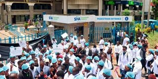 Members of the Kenya Medical Practitioners, Pharmacists and Dentists Union (KMPDU) demonstrate outside the Social Health Authority (SHA) headquarters in Nairobi on March 18, 2025.