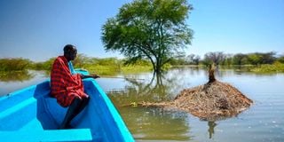 Richard Lichan Lekuterer, 60, sits in a boat as it glides above what used to be his homestead where only the ridge of a thatch roof of one of the four buildings that stood in his compound remains above water after his family was displaced by the encroaching waters of Lake Baringo at Salabani village near Marigat, Baringo county on the Kenyan Rift Valley, on October 5, 2020. PHOTO | AFP