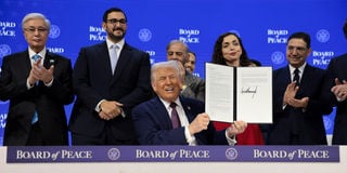 US President Donald Trump, alongside Kazakhstan’s President Kassym-Jomart Tokayev, Bahrain’s Minister of the Prime Minister’s Court Shaikh Isa bin Salman bin Hamad Al Khalifa, Pakistan’s Prime Minister Shehbaz Sharif, Kosovo’s President Vjosa Osmani, and Morocco’s Foreign Minister Nasser Bourita, takes part in the announcement of the charter for his Board of Peace initiative aimed at resolving global conflicts, during the 56th annual World Economic Forum (WEF) in Davos, Switzerland, on January 22, 2026.