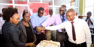 Business Daily editors cut a cake to celebrate Business Daily's 10th anniversary at the business newsroom, Nation Centre, Nairobi, March 20, 2017. PHOTO | DIANA NGILA | NMG
