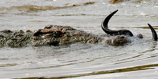 A crocodile attacks a wildebeest as it crosses the Mara river during a migration in Masaai Mara game reserve, 270 km (165 miles) southwest of capital Nairobi, July 28, 2009. Fishermen at Lake Victoria live in constant fear of what lurks in the waters Photo/REUTERS