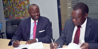 Kuramo Capital chief executive Shaka Kariuki (left) and Sterling Capital chairman Stanley Ngaine during the signing of the deal in Nairobi. PHOTO | SALATON NJAU | NMG