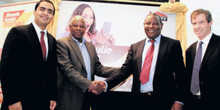 From Left: Airtel Kenya CEO Adil Youseffi, Finserve chairman John Waweru, Equity Bank CEO James Mwangi and chief officer, finance, innovation and techology John Staley during the unveiling of the bank’s Mobile Virtual Network Operator (MVNO) rollout plan in May. FILE