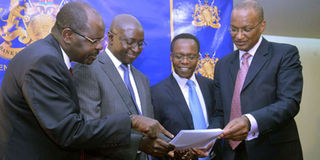 CBK governor Patrick Njoroge (right) with Kenya Bankers Association members Habil Olaka (left), Lamin Manjang (centre) and John Gachora. FILE PHOTO | NMG