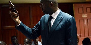 Lawyer Irungu Kang'ata displays a beer bottle at the Milimani Law Courts on January 3, 2020 during the hearing of a case pitting distributors against East Africa Breweries Limited (EABL). PHOTO | FRANCIS NDERITU | NMG