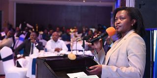 Family Bank Chief Executive Officer Rebecca Mbithi addressing the bank's investor briefing at the Sarova Stanley on November 25, 2019. PHOTO | DIANA NGILA | NMG