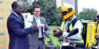 National Transport and Safety Authority Deputy Director for Safety Enforcement Badu Katelo (left), Glovo Kenya General Manager William Benthall and a rider at the launch of a road safety partnership in Nairobi in October. FILE PHOTO | NMG