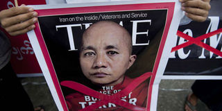 A demonstrator carries a past issue of Time magazine carrying a picture of controversial Myanmar monk Wirathu on its cover. FILE PHOTO | AFP | YE AUNG THU