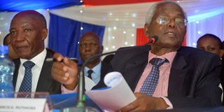 Britam Group MD Benson Wairegi (left) and board chairman Francis Muthaura during the firm’s Annual General Meeting on June 9, 2017. FILE PHOTO | SALATON NJAU | NMG