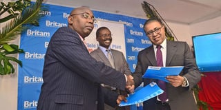 From left-Britam General Insurance acting chief executive officer, Group Principal Executive Director Stephen Wandera and Healthcare Global Kenya limited Country head Navnit Sigh Arora on October 17, 2019 at Britam Tower in Nairobi. PHOTO | SALATON NJAU | NMG