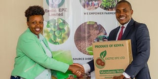 Exotic EPZ Managing Director, Jane Maigua, and Redavia Sales Director Erick Bungu shake hands after the signing of the partnership agreement on March 13, 2020. PHOTO | COURTESY