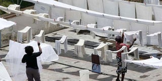 Workers wash linen on the rooftop of a hotel in Nakuru. A US-based commercial laundry firm Alliance Laundry Systems is planning to open shop in Kenya. file photo | nmg
