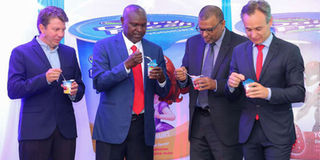 From left: Walt Disney Africa's retail manager William John Willis, Kenya Dairy Board's Philip Cherono and Brookside's COO Faiz Taib and marketing manager Oliver Mary sample Disney-branded yoghurt during its launch in Nairobi, Dec 7, 2017. PHOTO | SALATON NJAU | NMG