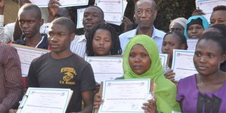 Businessman John Chomba with some of the youth who have completed entrepreneurship training. PHOTO | COURTESY