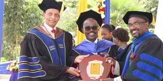Commission for University Education CEO Mwenda Ntaragwi (right) presents KIE chief Parmain ole Narikae (left) with a top doctorate student award during a graduation ceremony at USIU. Looking on is Vice-Chancellor, Prof Paul Tiyambe Zeleza. PHOTO | COURTESY