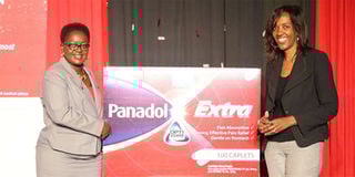Glaxosmithkline General Manager EA Debra Mallowah (right) and GSK Marketing Manager for Wellness Maureen Kayi (left) display a model of the new pack during the official launch of the new Panadol Extra. PHOTO | COURTESY