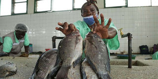 A fishmonger at the Kisumu Fish Market. Kenya’s production is below the consumption, requiring imports. FILE PHOTO | NMG