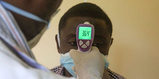 A health worker demonstrates how a patient's temperature is taken when suspecting a Covid-19 attack. FILE PHOTO | NMG