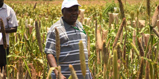 Dr Henry Ojulong’, a pearl millet breeder at ICRISAT, checks the crop’s progress at Kiboko Research Station. PHOTO | COURTESY