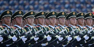 Chinese soldiers marching in formation during a military parade in Tiananmen Square in Beijing on September 3, 2015, to mark the 70th anniversary of victory over Japan and the end of World War II. AFP PHOTO