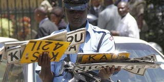 A police officer holds number plates removed from taxis on City Hall way on March 5, 2014. Justice Isaac Lenaola has ordered that all cars impounded during the matatu strike be released. Photo/Jeff Angote