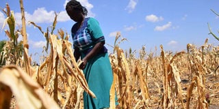 Elizabeth Nduku, a farmer in Machakos County, inspects her maize crop that was devastated by drought and fall armyworms. PHOTO | COURTESY