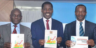 Industry and Trade Secretary Peter Munya (centre), PS Francis Owino (left) and KenInvest chairman Dennis Waweru during launch of the policy guide in Nairobi on November 6, 2019. PHOTO | COURTESY