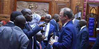 National Assembly Transport Committee members chat with Kenya Airports Authority MD Jonny Andersen (right) during a meeting with stakeholders on the proposed takeover of JKIA by Kenya Airways on February 26, 2019. PHOTO | DIANA NGILA | NMG